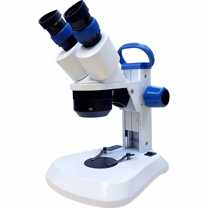 В микроскопе установлена бинокулярная насадка, наклон которой составляет комфортные 45°. Так как наблюдения можно вести сразу двумя глазами, это снижает нагрузку на зрение при длительной работе с микроскопом. Увеличение меняется дискретно, всего доступно три фиксированных кратности: 10х, 20х и 40х. Смена увеличения происходит путем поворота корпуса объектива, при этом фокусировка не сбивается. Для освещения предметного столика, который дополнен зажимами, используется комбинированная светодиодная подсветка. Рабочее расстояние составляет 57 мм. Для левого окуляра можно выполнять корректировку диоптрий.